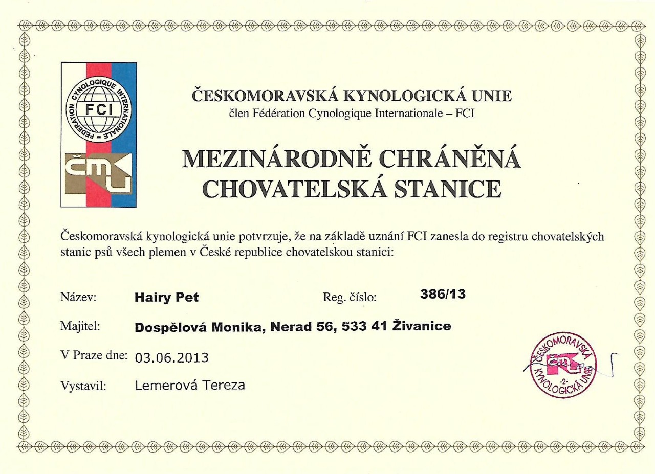 Naše mezinárodně chráněná chovatelská stanice "Hairy Pet" byla zanesena do registru chovatelských stanic psů všech plemen v České republice 3.6.2013 pod reg.číslem 386/13.