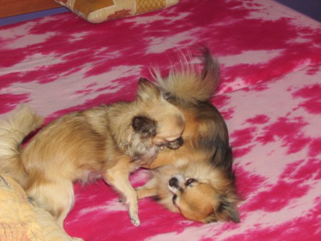 Naše čivavky s námi žijí v rodinném domku se zahradou, takže mají výběh ven celoročně a za každého počasí, ve svých pelíšcích spinkají, když jsme v práci, jinak s námi v ložnici. Mají volný pohyb po celém domě, nechtějí být nikdy sami kam se pohnem tam jsou všude s námi, rádi jezdí také na výlety. Moc jsme se do našich čivavek zamilovali, život bez nich už si nedovedem představit. Jsou mazlivý a přítulný je to malý pejsek s velkým srdíčkem. Chodíme na procházky a také se účastníme v rámci možností i výstav s pěknými výsledky. Doma v zimních měsících takto dovádíme, nebo se válíme a spinkáme. Postupně se rozrůstáme.